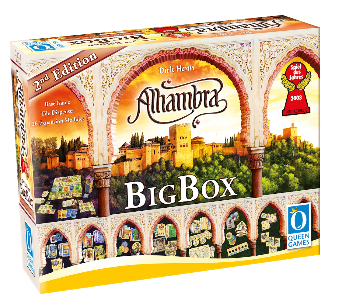 The Alhambra: Big Box (Second Edition) features all new artwork and includes all 6 expansions and the 2 Queenies amounting to 26 modules.