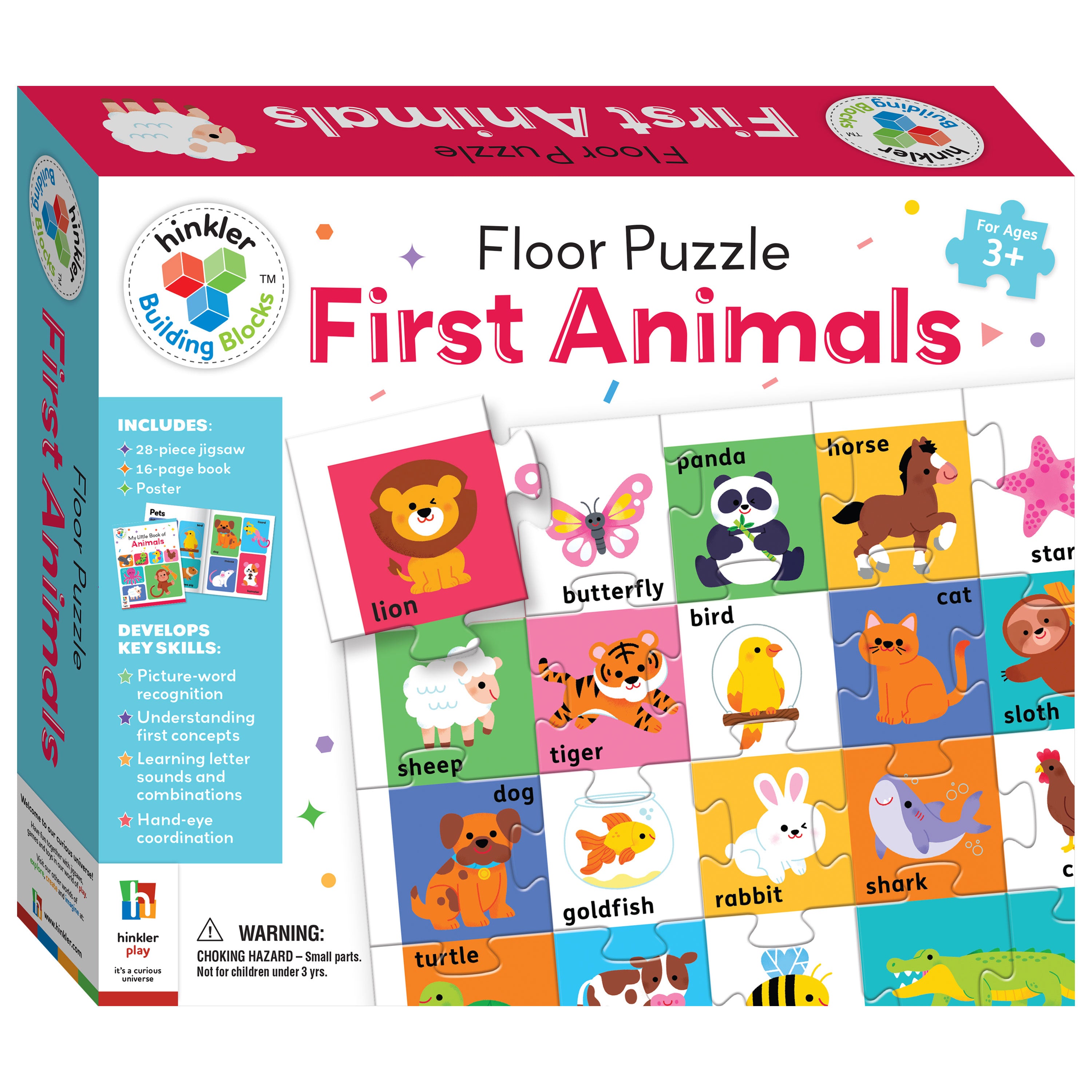 Learning about first words is fun with Building Blocks Floor Puzzle First Animals. This 28-piece jigsaw makes a large puzzle featuring bright, engaging images of adorable animals. Early learners will love the handy poster inside to practise learning first words and as a guide to help complete the puzzle. This modern and immersive puzzle is supported by a 16-page first words book!